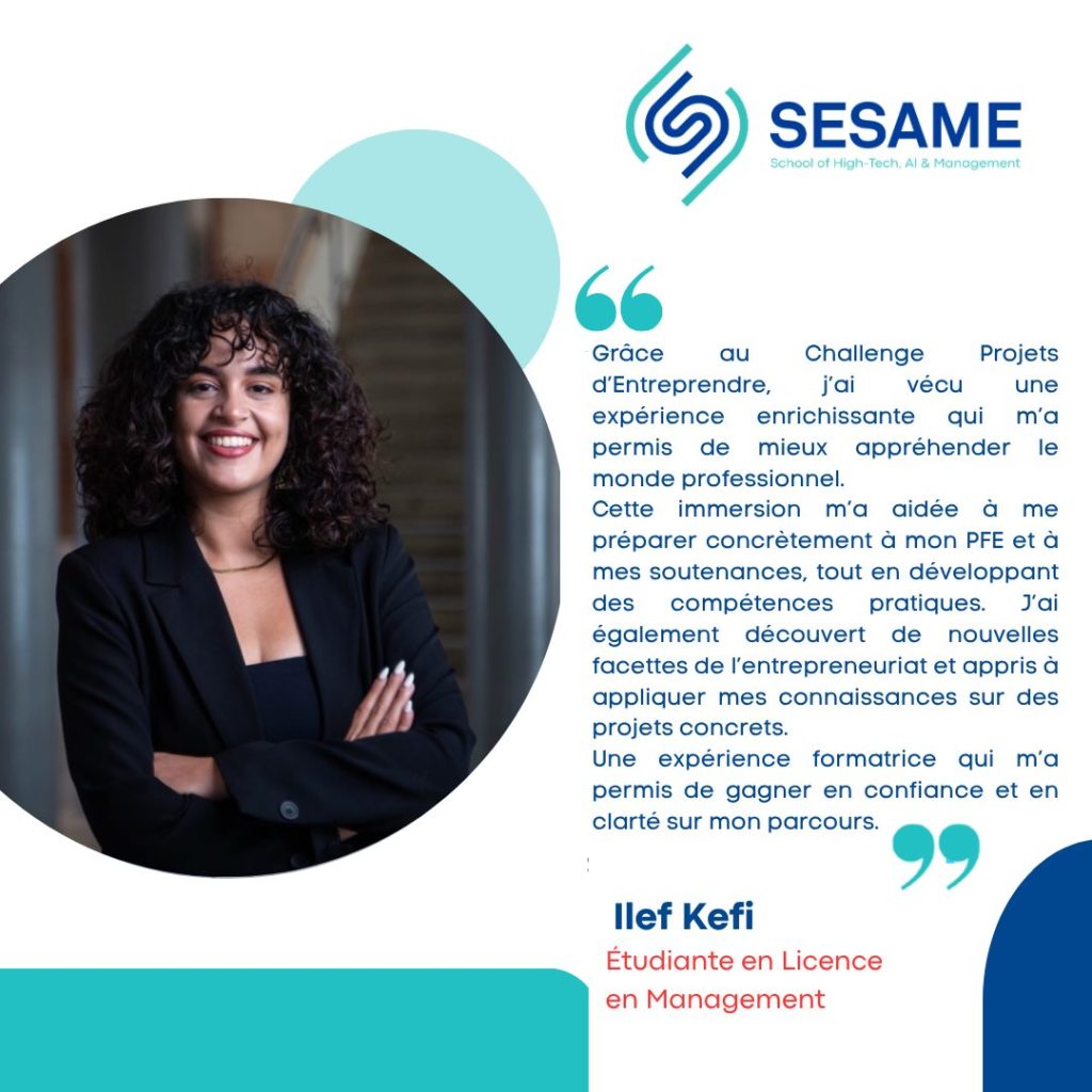Ilef Kefi, étudiante en management, a vécu une expérience particulièrement enrichissante grâce au Challenge Projets d’Entreprendre, qui lui a permis de mieux appréhender le monde professionnel. Cette immersion lui a offert l’opportunité de se préparer concrètement à son projet de fin d’études (PFE) et à sa soutenance, tout en développant des compétences pratiques essentielles.
